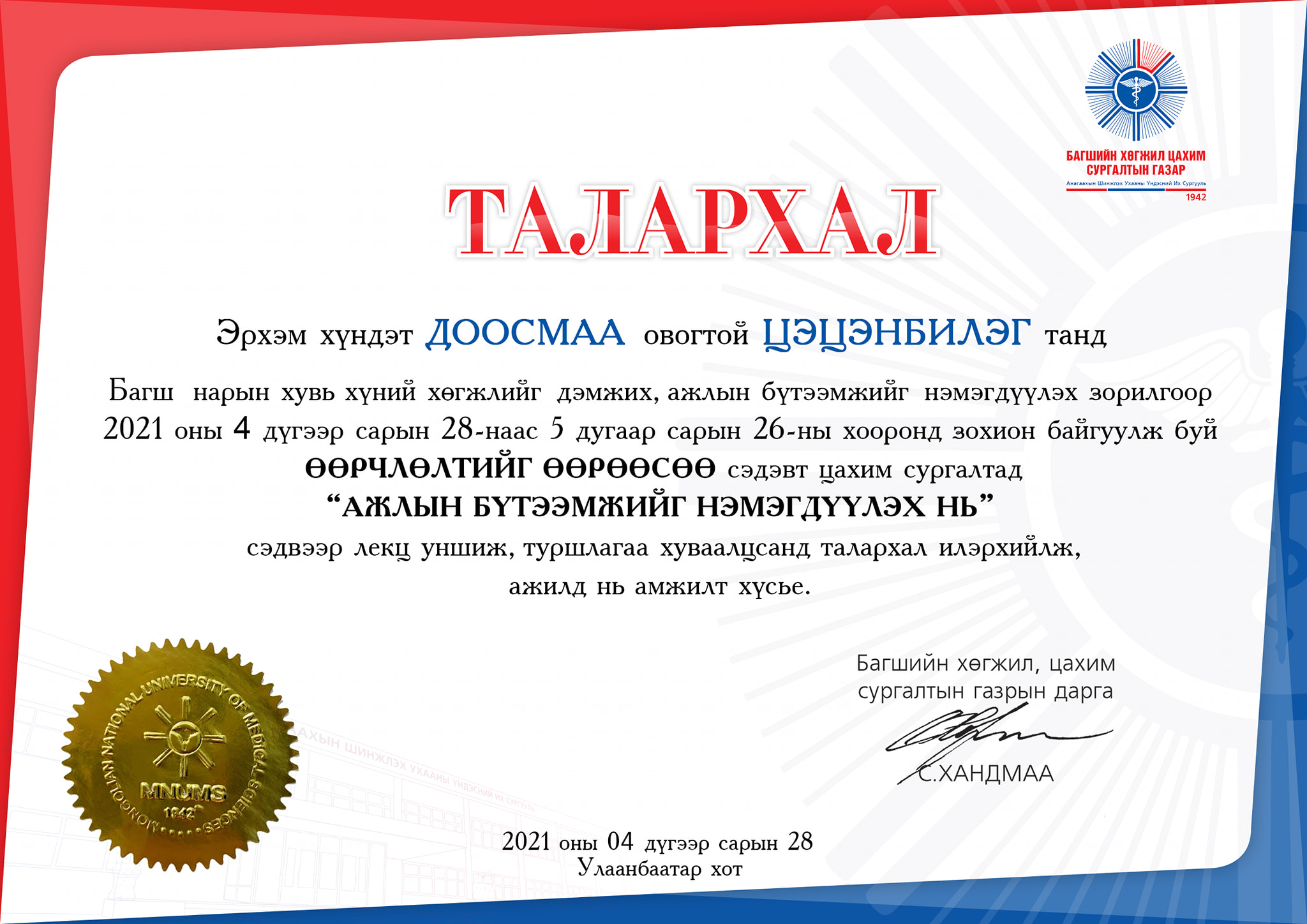 Миний бие нь 2019 онд “Амьдрах стратеги” гэдэг нэртэй хувь хүний хөгжлийн хөтөлбөрийг санаачлан Монгол Улсад хэрэгжүүлж эхэлсэн . Энэ сургалт маань менежмент ба сэтгэл судлалын шинжлэх ухааны үзэл баримтлалд суурьладаг. 2019 оноос хойш миний бие нь энэхүү хөтөлбөрийн хүрээнд хүний хөгжлийн сургалтыг амжилттай зохион байгуулж, төрийн болон хувийн хэвшлийн 200 гаруй байгууллагын (давтагдсан тоогоор) хүмүүсийг цэгцтэй сэтгэх, урам зоригтойгоор зорилгоо биелүүлэхэд нь дасгалжуулж байна.